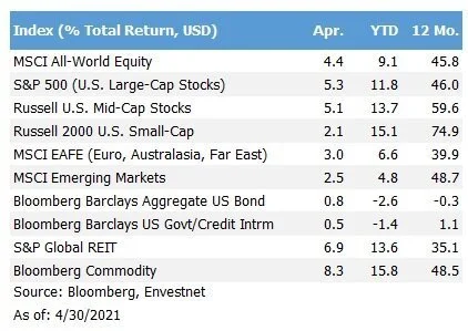Global stocks gained over 9% in the first four months of 2021. After such a strong recovery at the end of 2020, few expected such gains to continue this year.