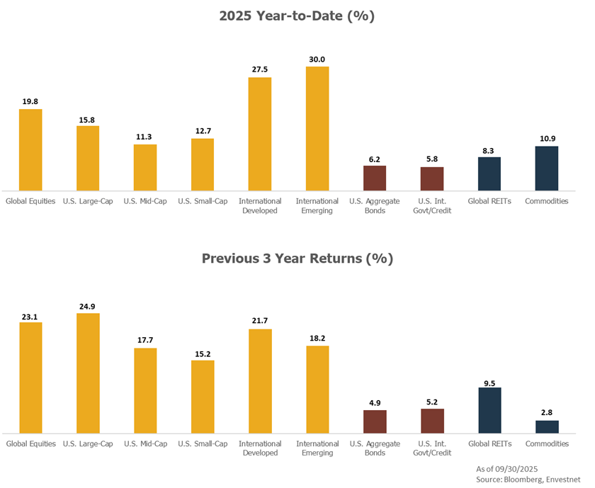 The third quarter was a powerful reminder of how quickly sentiment can shift. Global stocks continued their upward march, with the All-Country World Index returning 7.6%. The S&P 500 gained 8.1%, and the tech-heavy Nasdaq climbed 11.4%. All three reached record highs in September, capping an impressive year-to-date performance of 19.8%, 15.8%, and 19.4% respectively.