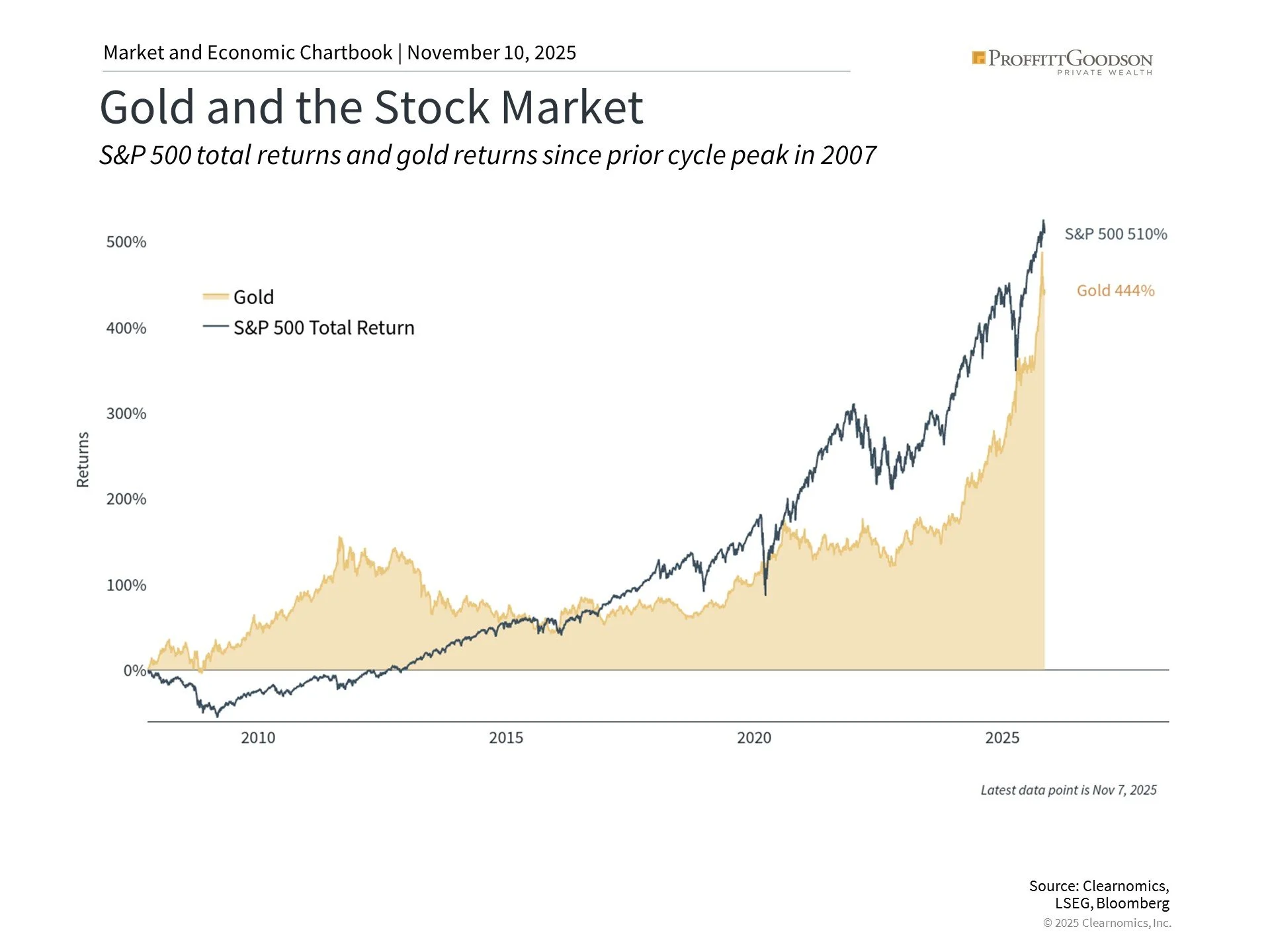 For some investors, gold plays a role within a broader allocation to commodities, which have also advanced. The Bloomberg Commodity Index, with a 15% weighting in gold, has risen over 12.5% year-to-date. Yet commodities as a whole remain cyclical and unpredictable, often providing diversification benefits but little long-term outperformance relative to stocks and bonds.